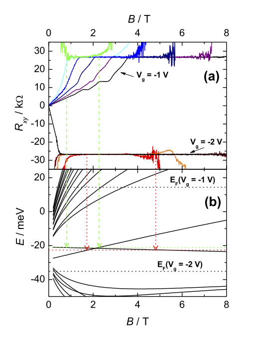 Due to this fact, one observes a Hall effect in a certain range of fields, even when the Fermi level is placed in the middle of the zero-field band gap. And indeed, by comparing the experimental results with the expected behavior of the Landau levels, you see that the positions of the Fermi-level crossings coincide with the re-entrant Hall plateaus of the experimental traces - as marked by the green and red arrows.