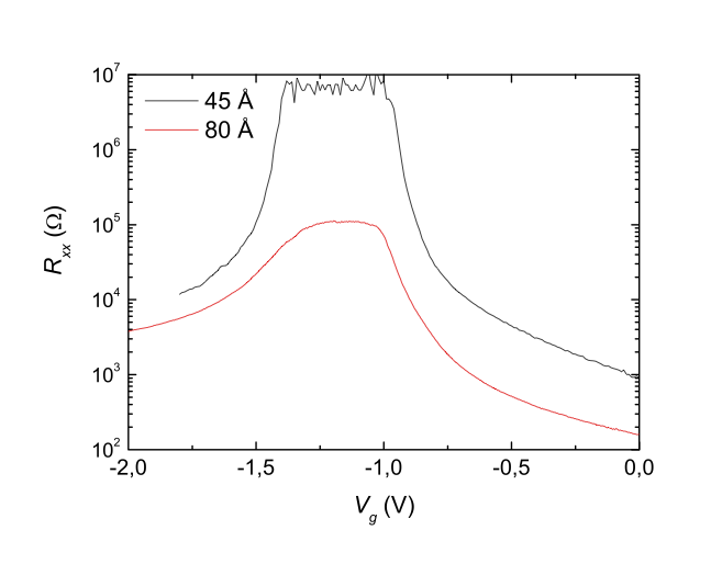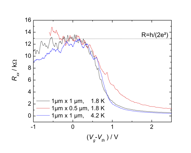 What you notice is that the maximum resistance for the 4.5 nm thick quantum well is much higher than for the 8 nm thick well. Given that theory predicts that the HgTe quantum wells described by Michael Wimmer in his video are topological when their thickness is between 6.3 nm and 12 nm, this measurement suggests that the lower resistance of the 8 nm thick well might be due to edge conductance. But even though it is the lower of the two, you might complain that the resistance of the 8 nm well is closer to 100 than the predicted 12 from the quantum of conductance.